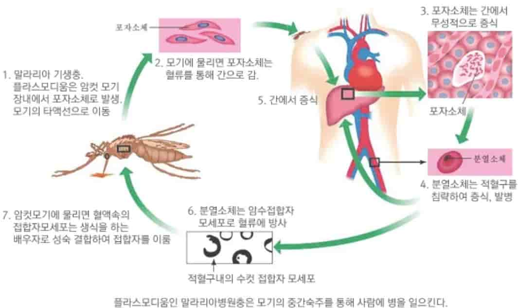 말라리아 원충이 적혈구에서 다시 성장하면서 암수 생식모체라는 것이 만들어지는데 이 때 말라리아 매개모기인 중국 얼룩날개모기가 사람의 피를 흡혈하면 이들이 다시 모기를 감염시킴으로써 점차 말라리아가 전파가 됩니다.