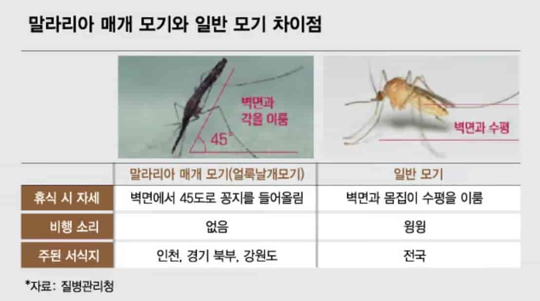 국내 말라리아 매개체인 얼룩날개모기는 일반 모기와 구분되는 3가지 특징들이 있습니다.